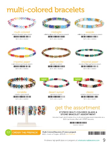 Includes 3 each of all 9 styles of our multi-colored glass stretch bracelets on a