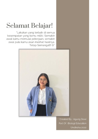Selamat Belajar! “Lakukan yang terbaik di semua kesempatan yang kamu miliki. Semakin awal kamu memulai pekerjaan, semakin awal pula kamu akan melihat hasilnya. Tetap Semangat!! ” Created By : Agung Dewi Part Of : Biologi Education Undiksha 2022