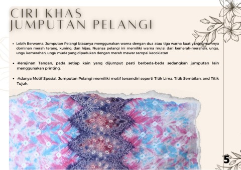 ·Adanya Motif Spesial, Jumputan Pelangi memiliki motif tersendiri seperti Titik Lima, Titik Sembilan, and Titik