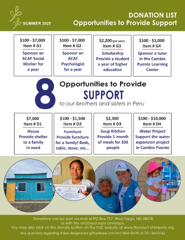 You may also click on the donate button on the FoC website at www.friendsof chimbote.org.