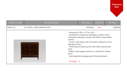395406 322 EA POWELL THREE DRAWER CHEST 99,680.00 40% 59,808.00