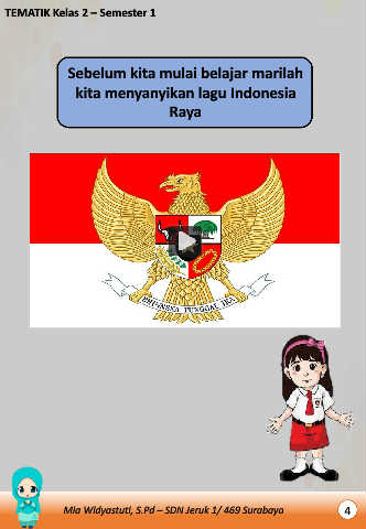 TEMATIK Kelas 2 – Semester 1 Sebelum kita mulai belajar marilah kita menyanyikan lagu Indonesia Raya Mia Widyastuti, S.Pd – SDN Jeruk 1/ 469 Surabaya 4