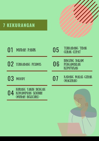 7 KEKURANGAN 01 MUDAH PANIK 05 TERKADANG TIDAK GERAK CEPAT 02 TERKADANG PESIMIS 06 BINGUNG DALAM PENGAMBILAN KEPUTUSAN 03 07 KADANG MALAS GERAK MOODY (MAGERAN) 04 KURANG YAKIN DENGAN KEMAMPUAN SENDIRI (MUDAH INSECURE)