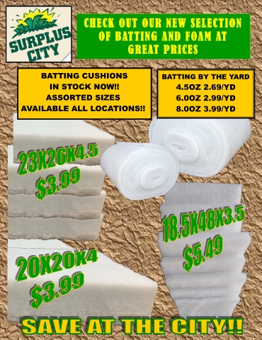 CHECK OUT OUR NEW SELECTION OF BATTING AND FOAM AT GREAT PRICES BATTING CUSHIONS BATTING BY THE YARD IN STOCK NOW!! 4.5OZ 2.69/YD ASSORTED SIZES 6.0OZ 2.99/YD AVAILABLE ALL LOCATIONS!! 8.0OZ 3.99/YD