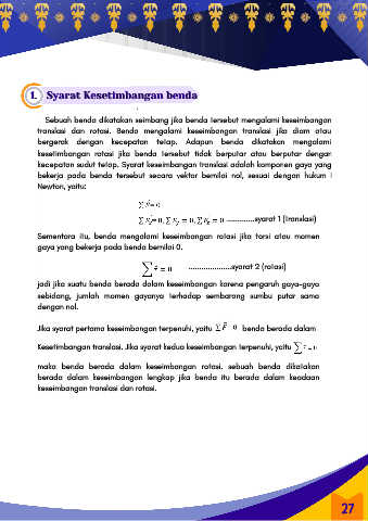 Kesetimbangan translasi. Jika syarat kedua keseimbangan terpenuhi, yaitu