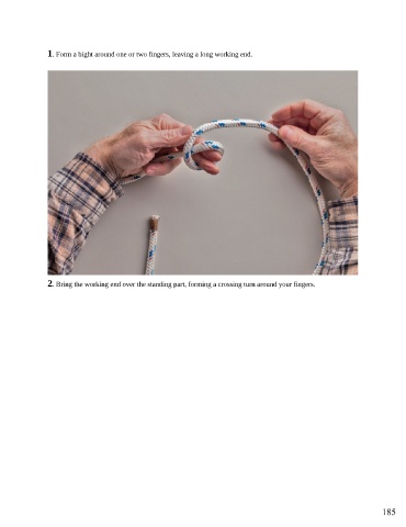 1. Form a bight around one or two fingers, leaving a long working end. 2. Bring the working end over the standing part, forming a crossing turn around your fingers. 185
