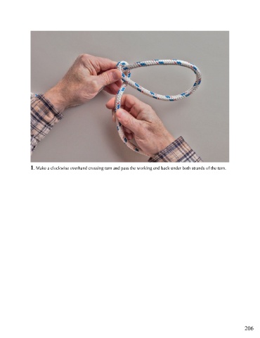 1. Make a clockwise overhand crossing turn and pass the working end back under both strands of the turn. 206
