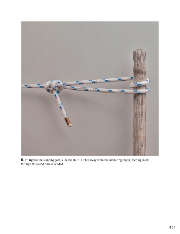6. To tighten the standing part, slide the Half Hitches away from the anchoring object, feeding slack through the round turn as needed. 474