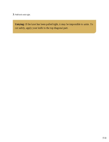 3. Pull both ends tight. Untying: If the knot has been pulled tight, it may be impossible to untie. To cut safely, apply your knife to the top diagonal part. 510