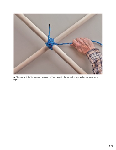 5. Make three full adjacent round turns around both poles in the same direction, pulling each turn very tight. 571