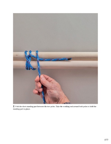2. Fold the short standing part between the two poles. Take the working end around both poles to hold the standing part in place. 577