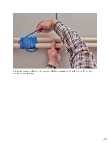 5. Bring the working end down to the opposite end of the wraps and pull it back between the two poles. Pull this frapping turn tight. 580