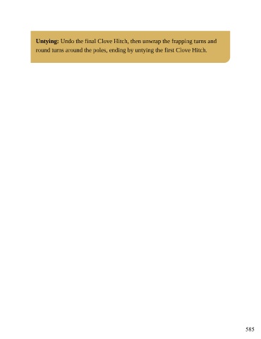 Untying: Undo the final Clove Hitch, then unwrap the frapping turns and round turns around the poles, ending by untying the first Clove Hitch. 585