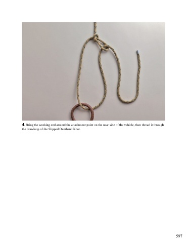 4. Bring the working end around the attachment point on the near side of the vehicle, then thread it through the drawloop of the Slipped Overhand Knot. 597
