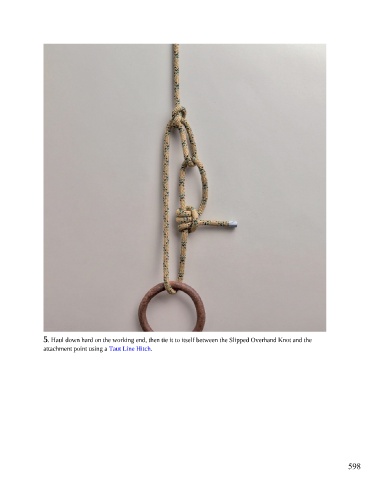 5. Haul down hard on the working end, then tie it to itself between the Slipped Overhand Knot and the attachment point using a Taut Line Hitch. 598