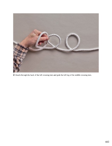 2. Reach through the back of the left crossing turn and grab the left leg of the middle crossing turn. 602