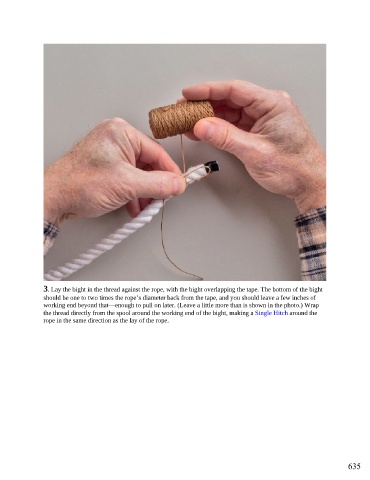 3. Lay the bight in the thread against the rope, with the bight overlapping the tape. The bottom of the bight