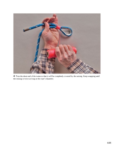 4. Trim the short end of the twine so that it will be completely covered by the seizing. Keep wrapping until the seizing is twice as long as the rope’s diameter. 648