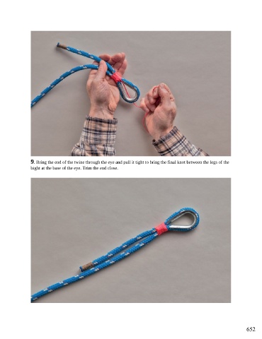9. Bring the end of the twine through the eye and pull it tight to bring the final knot between the legs of the bight at the base of the eye. Trim the end close. 652