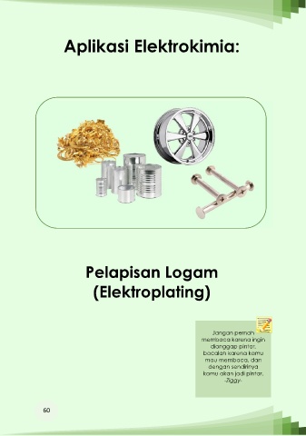 Aplikasi Elektrokimia: Pelapisan Logam (Elektroplating) Jangan pernah membaca karena ingin dianggap pintar, bacalah karena kamu mau membaca, dan dengan sendirinya kamu akan jadi pintar. -Ziggy- 60
