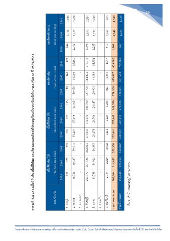 ตารางที่ 3-4 แสดงเนื้อที่ยืนต้น เนื้อที่ให้ผล ผลผลิต และผลผลิตต่อไร่ของทุเรียนเป็นรายจังหวัดในภาคตะวันออก ปก 2559-2561 2559 126 56,234 - 171,092 24,178 - 1,211 252,841 608,512