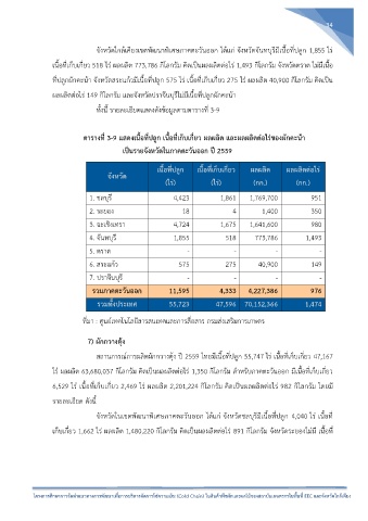 เก็บเกี่ยว 1,662 ไร่ ผลผลิต 1,480,220 กิโลกรัม คิดเป็นผลผลิตต่อไร่ 891 กิโลกรัม จังหวัดระยองไม่มี เนื้อที่