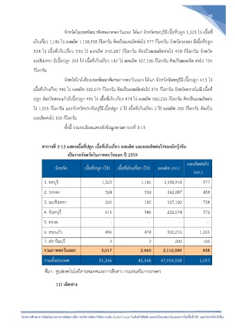 ตารางที่ 3-13 แสดงเนื้อที่ปลูก เนื้อที่เก็บเกี่ยว ผลผลิต และผลผลิตต่อไร่ของผักบุ้งจีน