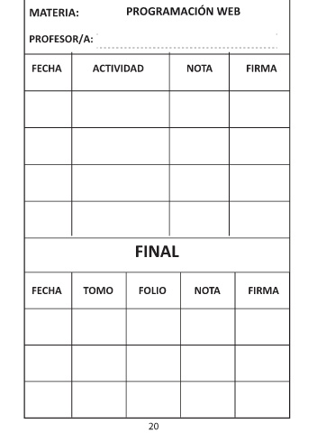MA TERIA: PROGRAMACIÓN WEB PROFESOR/A: FECHA ACTIVIDAD NOTA FIRMA FINAL FECHA TOMO FOLIO NOTA FIRMA 20