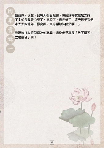 觀音像。現在,我每天都看經書,佛經講得實在是太好 了!如今我是心寬了、氣順了、病也好了!這些日子我們 家天天像過年一樣高興,真感謝妙法師父啊。」 我聽後打心眼兒裡為他高興,這位老兄真是「放下屠刀, 立地成佛」啊! 17