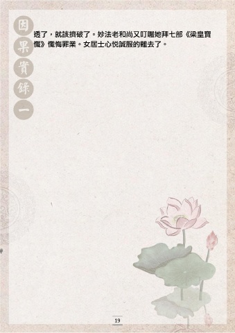 透了,就該擠破了。妙法老和尚又叮囑她拜七部《梁皇寶 懺》懺悔罪業。女居士心悅誠服的離去了。 19