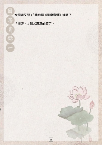 女記者又問:「我也拜《梁皇寶懺》好嗎?」 「很好。」師父滿意的笑了。 21