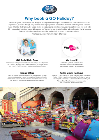 experiences, available through our preferred travel agent partners across New Zealand. Fantastic prices, a diverse range of holiday destinations, the widest choice of products and unmatched service ensures that when you book with GO Holidays it will truly be a memorable experience. You can be comfortable booking with us, knowing that all products featured in this brochure have been tried and tested by us or our overseas partners.