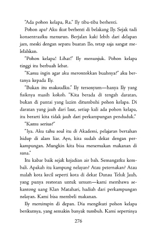 ”Ada pohon kelapa, Ra.” Ily tiba-tiba berhenti.