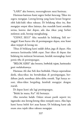 ”LARI!” aku berseru, mencengkeram surai harimau.