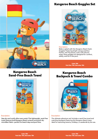 The ultimate adventure set! Includes a sand-free towel and matching backpack featuring the Kangaroo Beach team. Ideal for swimming lessons, holidays, or weekends by the sea.