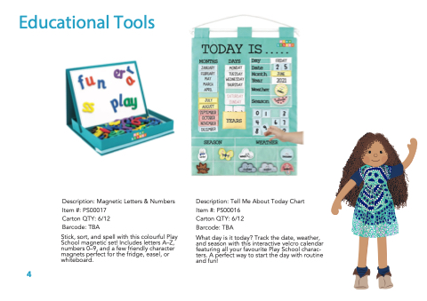 What day is it today? Track the date, weather, and season with this interactive velcro calendar featuring all your favourite Play School charac- ters. A perfect way to start the day with routine and fun!