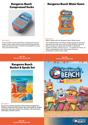A fun surprise in every pack! These compressed socks are bright, comfy cotton socks featuring the Kangaroo Beach logo and character prints. A perfect novelty gift for young fans and swimmers alike.
