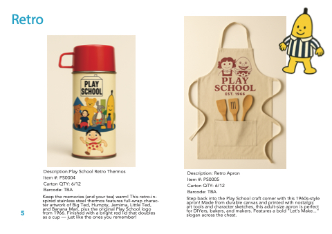 Keep the memories (and your tea) warm! This retro-in- spired stainless steel thermos features full-wrap charac- ter artwork of Big Ted, Humpty, Jemima, Little Ted, and Banana Man, plus the original Play School logo from 1966. Finished with a bright red lid that doubles as a cup — just like the ones you remember!