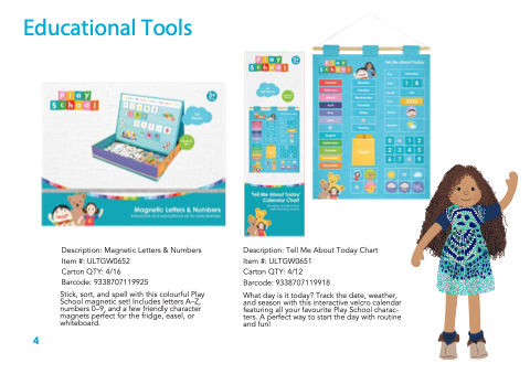 What day is it today? Track the date, weather, and season with this interactive velcro calendar featuring all your favourite Play School charac- ters. A perfect way to start the day with routine and fun!