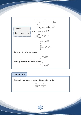∫ ∫ ( ) Ingat ! ( ) Dengan , sehingga Maka penyelesaiannya adalah, Contoh 2.2 Selesaikanlah persamaan diferensial berikut 14