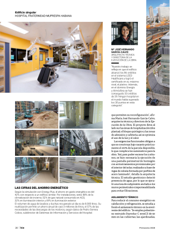 que permiten su reconfiguración”, afir- ma María José Hernando García-Calvo, arquitecta técnica y directora de la Eje- cución de la Obra. El proyecto lleva al lado sur las áreas de hospitalización (dos plantas), el bloque quirúrgico y las zonas de admisión y cafetería; así se optimiza elusodelaluzyelcalor.
