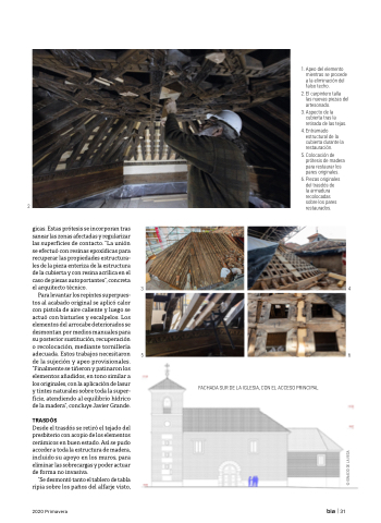 Para levantar los repintes superpues- tos al acabado original se aplicó calor con pistola de aire caliente y luego se actuó con bisturíes y escalpelos. Los elementos del arrocabe deteriorados se desmontan por medios manuales para su posterior sustitución, recuperación o recolocación, mediante tornillería adecuada. Estos trabajos necesitaron de la sujeción y apeo provisionales. “Finalmente se tiñeron y patinaron los elementos añadidos, en tono similar a los originales, con la aplicación de lasur y tintes naturales sobre toda la super- ficie, atendiendo al equilibrio hídrico de la madera”, concluye Javier Grande.