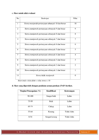 c. Skor untuk nilai evaluasi
