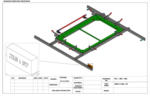 MAGNION FURNITURE INDUSTRIES A NO REVISION DRN CHKD DATE M.Faidz QUANTITY : DRAWN : DRAWING PLC - 384 - 001 NO 14/12/2022 MATERIAL : PART ASSY # JIG : 57 APPROVED : SURFACE NAME TREATMENT : 3RD ANGLE PROJECTION MODEL SCALE :