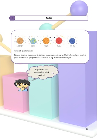 2 Median Amatilah gambar diatas! Gambar tersebut merupakan jenis-jenis planet pada tata surya. Dari kelima planet tersebut jika diurutkan dari yang terkecil ke terbesar. Yang manakah mediannya? . Bagaimana cara menentukan nilai median? 25