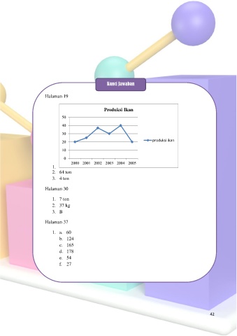 Kunci Jawaban Halaman 19 Produksi Ikan 50 40 30 20 produksi ikan 10 0 2000 2001 2002 2003 2004 2005 1. 2. 64 ton 3. 4 ton Halaman 30 1. 7 ton 2. 37 kg 3. B Halaman 37 1. a. 60 b. 124 c. 165 d. 178 e. 54 f. 27 42