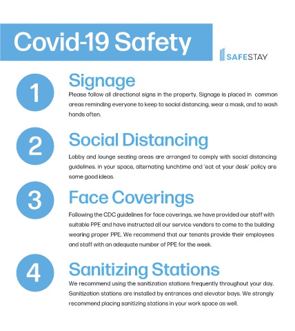 Sanitization stations are installed by entrances and elevator bays. We strongly