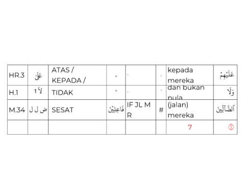 َ َ َ ATAS / kepada ح ح َ HR.3 عَل • • • مهيلع َٰ KEPADA / mereka َ dan bukan َ َ H.1 1 لا TIDAK • • • لاو pula َ ْ َ IF JL M (jalan) َ ّ ه M.34 ل ل ض SESAT ين ل عاف # ينلآضلٱ R mereka 7 ٧