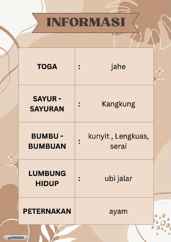 INFORMASI TOGA : jahe SAYUR - SAYURAN : Kangkung BUMBU - kunyit , Lengkuas, BUMBUAN : serai LUMBUNG : ubi jalar HIDUP PETERNAKAN ayam