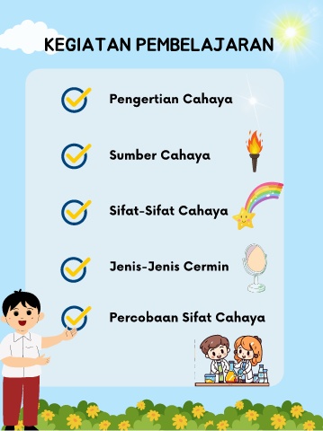 KEGIATAN PEMBELAJARAN Pengertian Cahaya Sumber Cahaya Sifat-Sifat Cahaya Jenis-Jenis Cermin Percobaan Sifat Cahaya